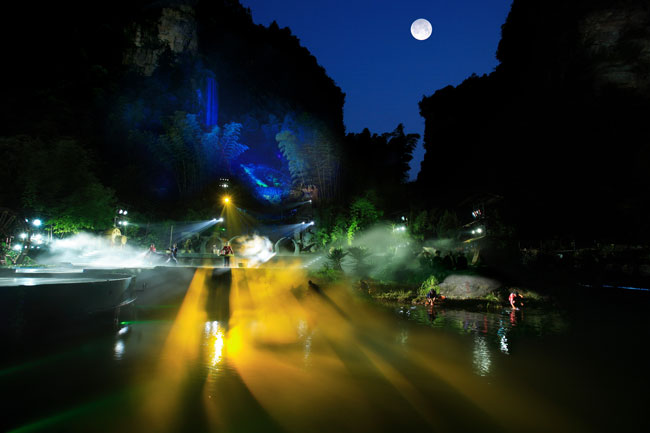 《武陵魂•梯瑪神歌》是一場記述土家族起源、演變、戰(zhàn)爭、生產(chǎn)生活等內(nèi)容的大型立體山水實景演出,揉合了音樂、舞蹈、文學(xué)等多種藝術(shù)形式,如幻如夢的舞美燈光,搖曳生姿的原生態(tài)歌舞……濃縮了土家族數(shù)千年的發(fā)展歷史,400多名演員以自然淳樸的表演充分的展示了土家的民族文化特征,給游客帶來了耳目一新的感受。一場視聽的饕餮盛宴,一曲驚天地、泣鬼神的曠世古歌,給人山水文化光影視聽的享受!境銎罚簭埣医缣莠斏窀栉幕瘋鞑ビ邢薰尽