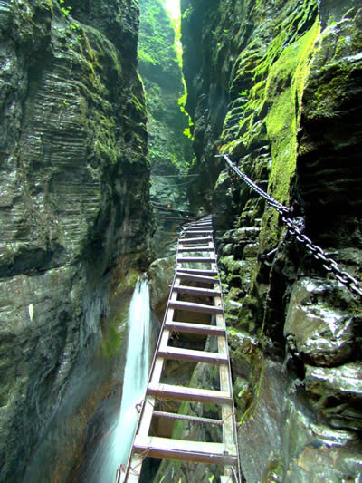 坐龍峽風(fēng)景區(qū) 坐龍峽擁有中國第一條特種游道。所有游道均建于峽谷深處,依山取勢,既經(jīng)細(xì)心雕琢聽卻又渾然天成。粗樸的板栗木棧道,可以讓你零距離的親近那一潭碧幽、聽聞山泉叮咚;精巧的跳墩,可以讓你媳戲流泉、觸感溪瀑;原質(zhì)的石坎道,讓你不得不調(diào)動全部的身心能量悉心攀援、感悟峽谷;有驚無險的鐵梯,讓你伴著腳下轟鳴的溪水,在驚怵中體味一份快慰。出口處的土家山寨,保留了古樸獨(dú)特的生活習(xí)俗。一塊臘肉就一口醇香的“苞谷燒”會讓你洗去所有的疲憊,在輕松中憨厚的主人向你講述過去強(qiáng)人出沒的故事......