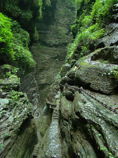 坐龍峽圖片 坐龍峽風(fēng)景區(qū)位于古丈縣河西鎮(zhèn),與“芙蓉鎮(zhèn)”--王村一水之隔。經(jīng)由300萬年大自然的風(fēng)吹、水蝕而成,一直隱逸于湘西茫茫十萬群山之中。它長約3500米,最大高差達(dá)300余米;寬處不足丈余,窄處僅容一人通過;谷內(nèi)絕壁縱疊,溪瀑橫懸,崖樹斜逸,異草遍坡。