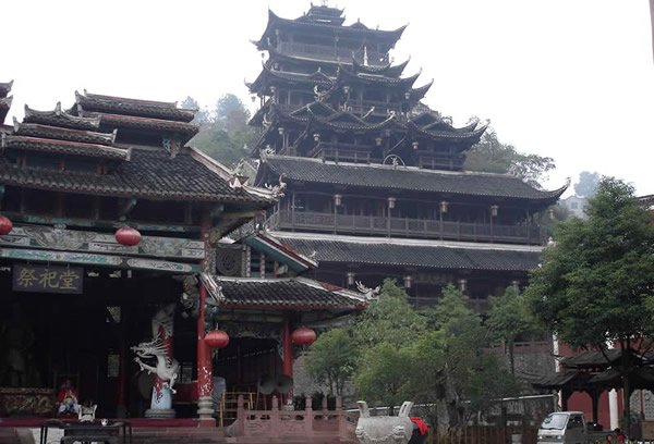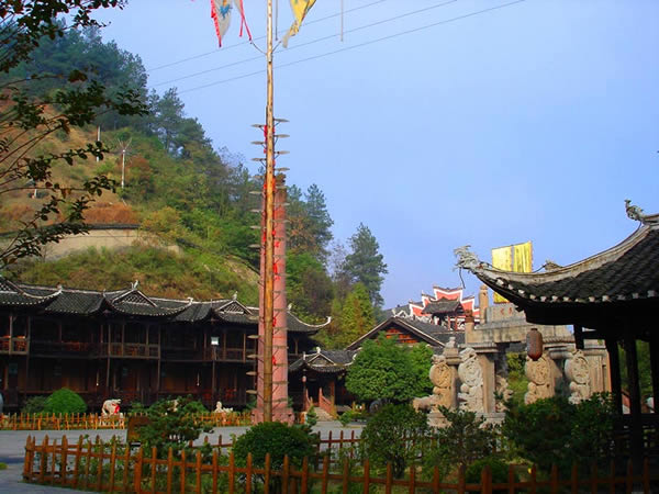 土司城 土司制度初建于五代十國時期,到了明朝己非常成熟了,土司王有無上的權(quán)威,在湘西有三大土司王分別是桑植土司向氏、永順土司王彭氏、慈利土司王張氏,其中又以永順溪州土司彭氏實力最強。其它土司王都為自己修建一座土司城,唯有彭氏分別在永定、永順修建了二座土司城。在永定的土司城內(nèi),彭氏為顯示其地位,修建了湘西最高的一座高達 48米,共12層的吊腳樓,整棟樓竟無一根鐵釘,堪稱土家吊腳樓建筑史上的奇跡,此樓于2002年9月被評為最高吊腳樓,榮獲世界吉尼斯之最,與此同時土司城內(nèi)舉辦一千人參加表演的毛古斯舞蹈活動獲得圓滿成功,同時獲得世界吉尼斯之最。進入土司城,首先看到土司城迎賓儀式,土家漢子迎賓鼓,吹牛角、放沖,土家姑娘攔門歌,敬攔門酒,進入城內(nèi),在祭祀堂前舉行百人土家大祭祖活動,男女老少唱擺手歌、跳擺手舞,登世界最高的吊腳樓九重天,參觀土家族千百年來文化展示。到土家山寨,聽土家歌,賞土家族最有代表風俗哭嫁,三棒鼓,花燈等民俗表演。