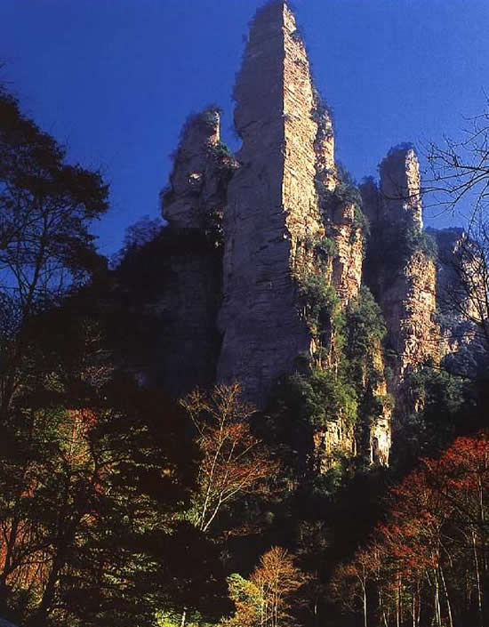 | 金鞭巖:過“閨門峰”沿溪而下約500米,有一座高約400米,孤標(biāo)直立,雄奇挺拔的奇峰,名金鞭巖。金鞭巖是武陵源著名景點,峰體上細(xì)下粗,四棱分明。棱面布滿節(jié)理橫紋,形成鞭節(jié),渾如一根豎插大地的長鞭。每當(dāng)夕陽晚照,鞭身涂金,熠熠閃光,瑰麗奪目,構(gòu)成一幅奇特壯美的“夕陽金鞭圖”。