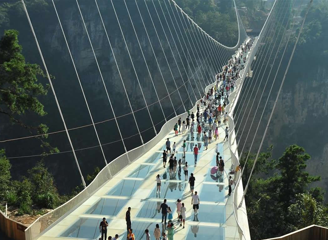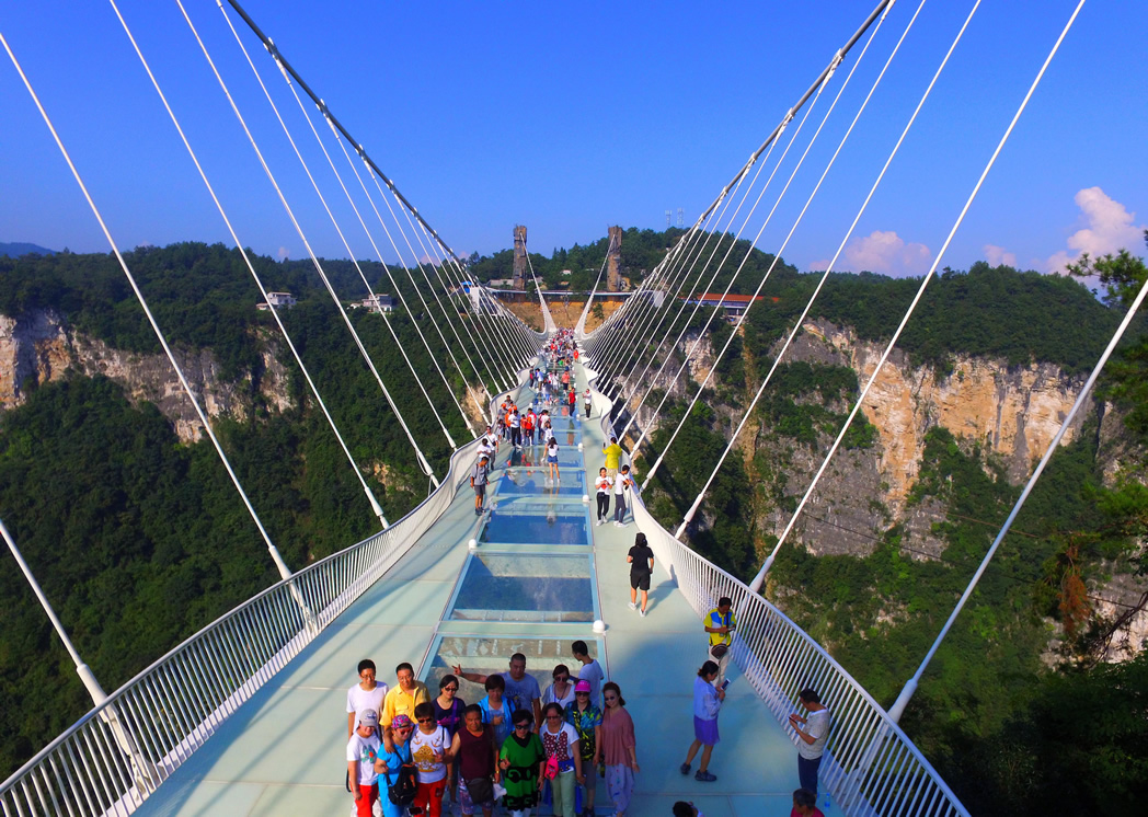 張家界大峽谷玻璃橋位于湖南省的張家界大峽谷景區(qū)栗樹埡和吳王坡區(qū)域內(nèi),為一座景觀橋梁,兼具景區(qū)行人通行、游覽、蹦極、溜索、T臺(tái)等功能。主跨430米,一跨過峽谷,橋面長(zhǎng)375米,寬6米,橋面距谷底相對(duì)高度約300米。這座全透明玻璃橋長(zhǎng)度、高度位居世界第一。